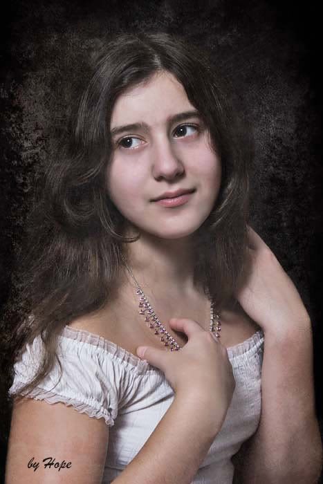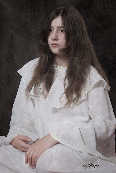 Первая специально стилизована под японские ужастики? :)) Вторая в духе потретов итальянских мастеров старой школы, очень красиво. Единственно, мне кажется левая рука как то не совсем ловко получилось, может из-за того, что пальцев не видно. Кстати, наверное, если бы это был живописный портрет, художник мог бы намеренно немного исказить пропорции, чтобы рука выглядела изящнее. С фото наверное, такой фокус не пройдет?