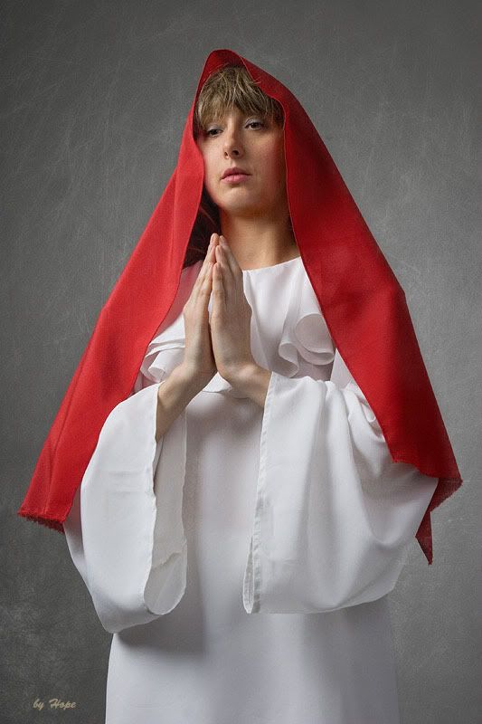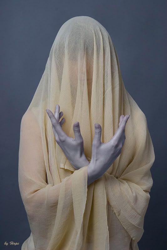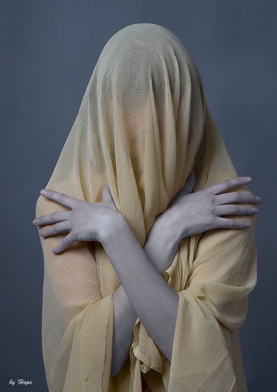 первая - хороша. быть может придать драматизма - лицо поднять кверху... рот открыть;) как вариант можно было намочить ткань, возможно даже частично. а вообще - ассоциации скорее с фигурами "плакальщиц" на склепе, кладбище... словом - готика рулит)) а еще если прядки выпустить розовые-голубые - ун-ца-ца - эмо будет)) на второй с прекрытым лицом - нравятся руки... если это "голубь " - быть может луч света в тёмном царстве пририсовать? "молящаяся" - красная ткань резко обрывается... эм... короче - девушка из душа размазывает крем по рукам)))
